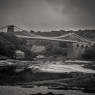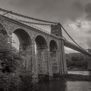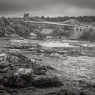 The island of Anglesey is separated from the Welsh mainland by the Menai Strait, about 16 miles long and between 400m and 1100m wide. This narrowing causes quite dramatic tidal effects, looking in places like a racing river. The strait is bridged in two places, by Telford’s Menai suspension bridge and the rebuilt Britannia bridge, with less than a mile between the two. Looking down from the Anglesey side on a clear day gives a magnificent view of the strait, the bridges and the Snowdonia mountains immediately behind. However, I wasn’t there on a clear day. It was cloudy and drizzly and grey – typical June welsh weather. I found this quite suitable for the industrial revolution architecture of the two bridges, especially in black and white. These pictures are the result.